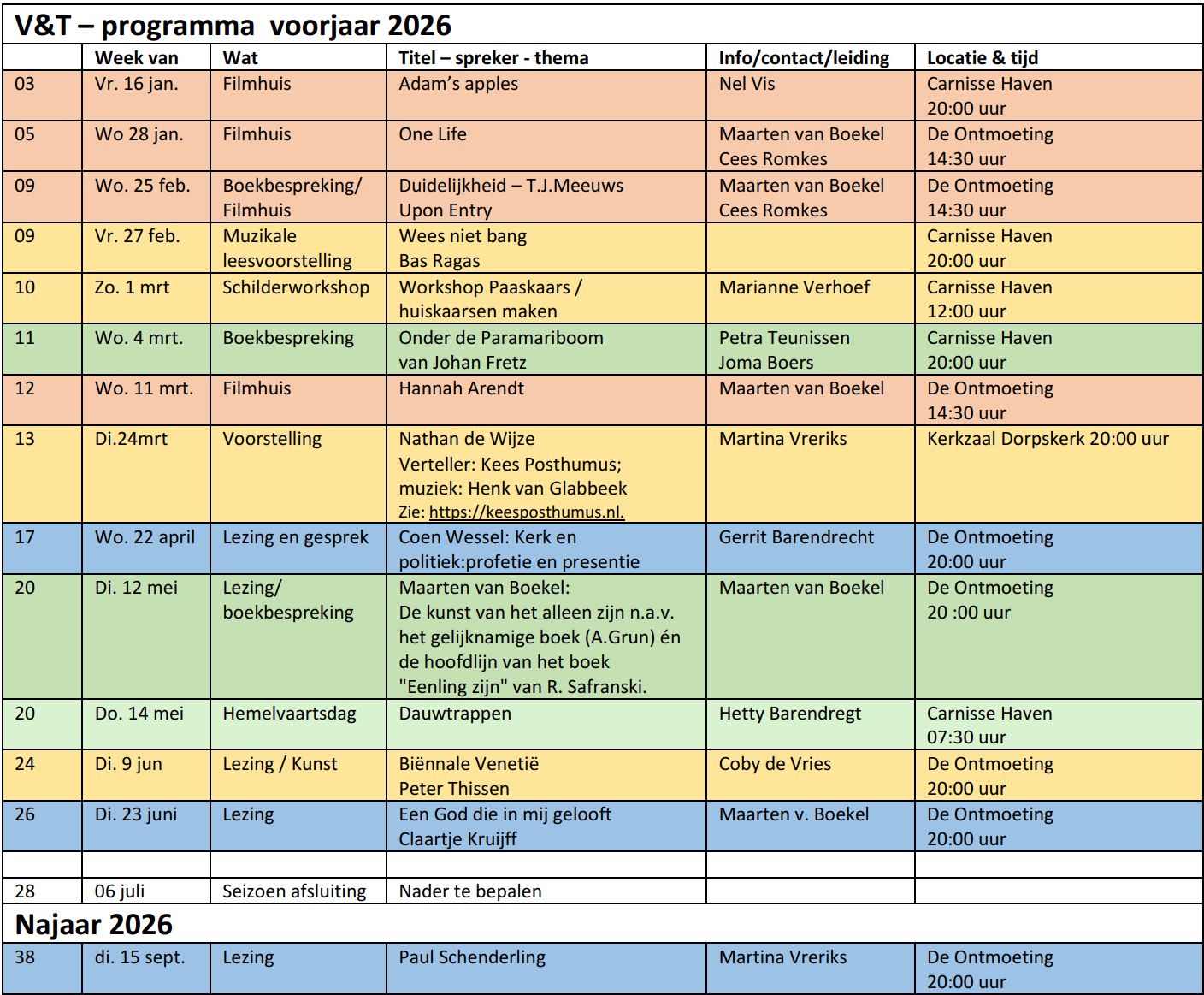 De oecumenische werkgroep Vorming en Toerusting (V&T) heeft het programma gepland voor het volgend jaar. De folder is er inmiddels ook en zal op de bekende plaatsen in de kerken worden neergelegd en verspreid. Hieronder het schematisch overzicht. U bent van harte uitgenodigd.